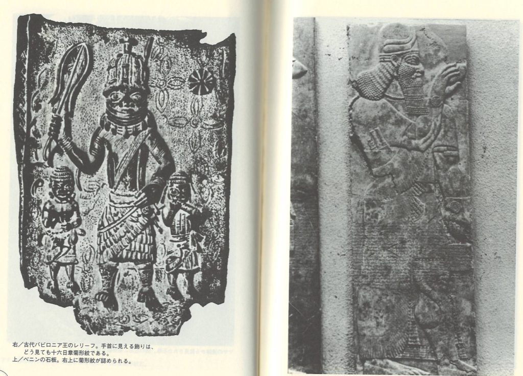 古代バビロニアは紀元前2000年から紀元前1000年にかけて栄えた王朝と言われております。(右側の画像)このレリーフは砂漠の真ん中から出土したということですが、手首に菊花紋がありますね。